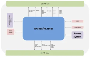CORE_RK3568_LP32 is a 55×55×3.1mm industrial module powered by the RK3568J SoC, integrates quad Cortex-A55 (up to 2.0GHz), 1TOPS NPU, and Mali-G52 GPU in single-sided SMT layout. It combines full I/O fan-out, low-power operation, and rugged packaging for rapid integration in edge AI, industrial automation, and embedded vision applications.