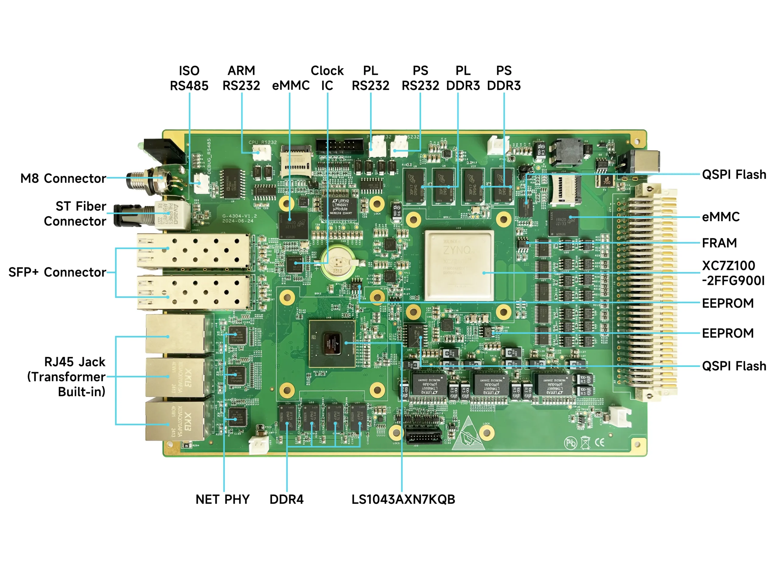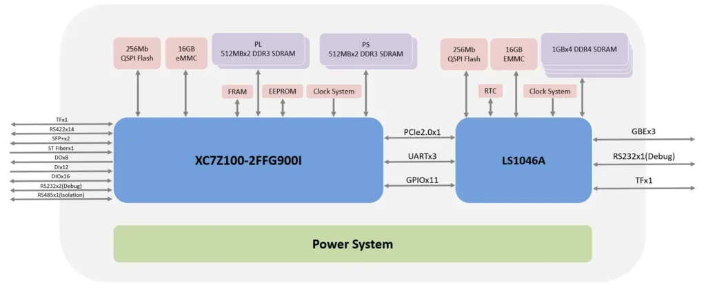 Heterogeneous Compute Partitioning: The quad-core ARM LS1043A handles heavy data computation and protocol stacks; the ZYNQ 7Z100 implements flexible logic and real-time control. This separation prevents single-chip overloads and reduces the risk of system downtime, improving overall reliability.